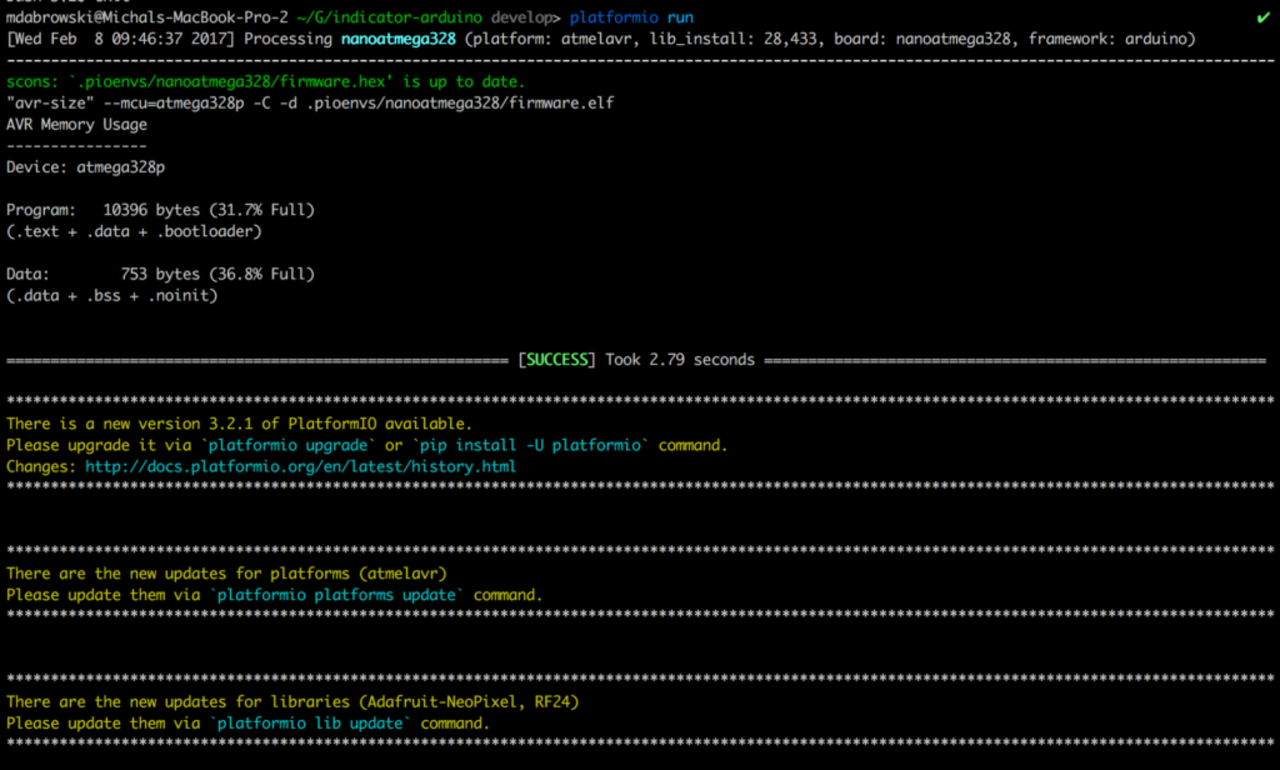 3. Connect the arduino nano into usb port and execute platformio run in project’s directory. You should see the following output (compilation and flashing arduino):