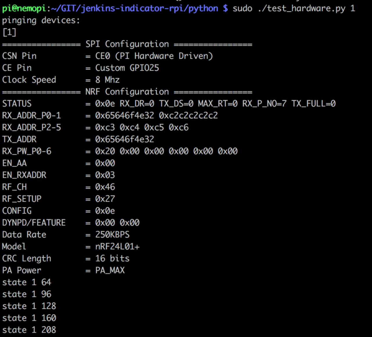 4. Download, compile, and install the RF24 library (can be found here: https://github.com/TMRh20/RF24). At this point you should be able to get nrf24 on Raspberry up and running. You can test it by invoking sudo ./test_hardware.py 1 2 3