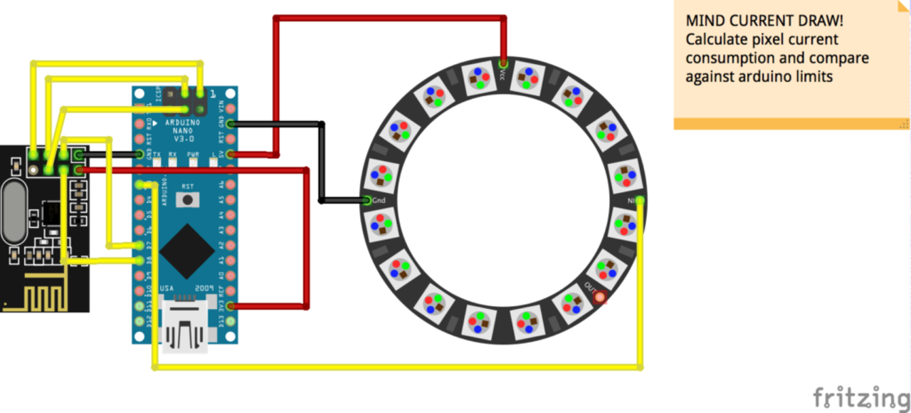 • Neopixel LED ring or strip  (we’ve used 8 LED pixels strip and 16 LED pixels ring; please mind current draw limits of Arduino when using larger number of pixels).