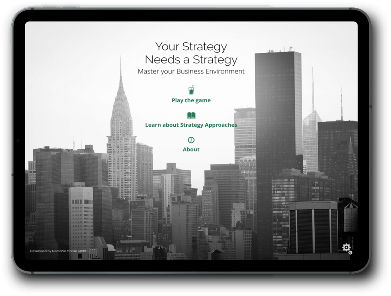 In enger Zusammenarbeit mit dem BCG Strategy Institute in New York konzipierte und realisierte Neofonie Mobile die Serious Gaming App „Your Strategy Needs a Strategy“ als Hybrid App. Um die Einflussfaktoren der Umgebungen und Strategien erlebbar zu gestalten, macht die Serious Gaming App den Spieler zum Besitzer eines Limonaden-Stands in New York City. Er muss sein Produkt in fünf verschiedenen Stadtteilen gewinnbringend verkaufen und sich gegen den Wettbewerb behaupten. Jeder Stadtteil entspricht einer anderen strategischen Umgebung und bedingt daher einen entsprechenden strategischen Ansatz. Der Spieler tritt dabei gegen den fiktiven Bruce (Bruce D. Henderson – 1963 Gründer von BCG) in bis zu drei Schwierigkeitsstufen an. Anhand der Simulation lernt der User spielerisch, welche Strategien bezogen auf Besonderheiten der Stadtteile am besten wirken und welche Investitionen sinnvoll sind. Dabei wird der Spieler durch Optimierungstipps mit Verweis auf die Buchreihe „Your Strategy Needs a Strategy“ unterstützt.